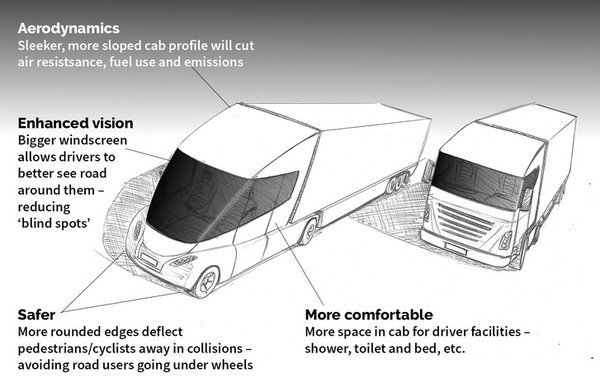 Európában jelenleg az úgynevezett bulldogfülkés kialakítás az uralkodó a teherautózásban. Ebben a felépítésben a motor teljes egészében a vezetőfülke alatt foglal helyet, ami a tehergépkocsikra vonatkozó hosszkorlátozások miatt nagyon bevett. A jövő ősszel életbe lépő új szabályozással viszont megnő a tehergépjárművek megengedett legnagyobb hosszúsága, a növekedést azonban csak a vezetőfülke aerodinamikai kialakításának javítására lehet majd használni, a járművek hasznos teherbírásának növelésére nem. Ez a fülkét érintő növekedés várhatóan 80-90 centiméter közötti lesz.