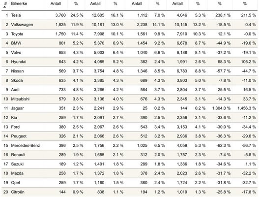Az Electric hozta le a hagyományosan minden másnál villanyautó pártibb norvég újautó-piac júniusi eladásait. A skandináv országban nem példátlan, hogy egy hónapot a Tesla nyerjen, a 3-as európai érkezése viszont úgy feltolta a kaliforniai márka eladásait, hogy több fogyott belőle mint a második Volkswagenből és a harmadik Toyotából összesen. A Tesla szerencséjére, mert az S-re és az X-re már épp kezdett ráunni a norvég piac. Ez volna itt a júniusi top20 a Tesla 3760-as eladásával az élen, amiből 2999 volt Model 3.