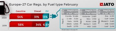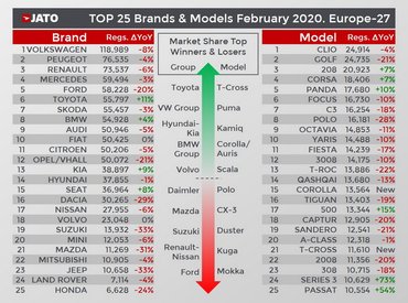 A járványról szóló hírek persze már hozzájárulhattak, hogy a tavalyi februárihoz képest 7%-kal alacsonyabbak lettek az eladások Európában, azt viszont nem magyarázzák, ahogy a kereslet egyértelműen a kisautók felé tolódott. A korábban egyértelmű piacvezető VW Golf-ból például 21%-kal kevesebb fogyott, mint tavaly – igaz, ez a közeledő modellváltás számlájára is írható – de a legnépszerűbb modellek listáján is az látszik, hogy a négyméteres kategória kezdi átvenni a főszerepet Európában.