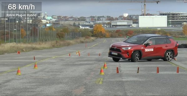 Tulajdonképpen nem is olyan friss az információ, már a tavalyi Tannistesten láthattuk – itt, lejjebb meg is nézhető –, hogy hogyan bukdácsol a RAV4-es a bóják között, ám a svéd magazin tesztelői egy korábbi, gyenge tesztet követően állítólag már javított szoftverrel kapták meg a plug-in változatot. Az eredmény alapján talán inkább kikapcsolt menetstabilizáló szoftverről lehet szó, mivel a konnektoros hibrid változat az eleve alacsonynak számító 68 km/h-s sebességnél a menetirányra merőlegesen csúszva sodorta el az út szélét jelképező bójákat.