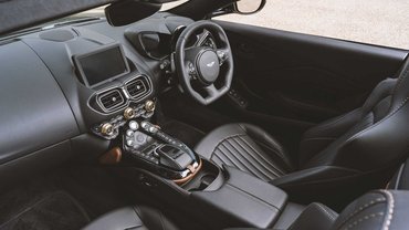 A spéci, fényes fekete fényezés, a bronzszínű részletek, a fémszín keretes hűtőrács és a feketére festett, vastag küllős kerekek mind hasonlóak a két autón. A komor színvilág egészen érdekes módon igazít a nyitott Vantage karakterén, de egyáltalán nem áll neki rosszul.