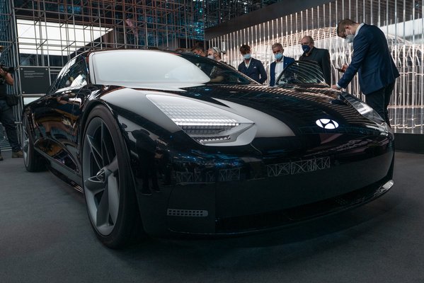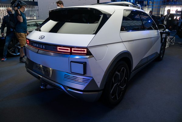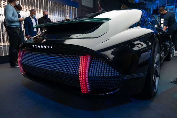 A Müncheni Szalonon elég sok cég meglehetősen kis területen állított ki, ez a Hyundai-ra is igaz. A Kia csak egy másik helyszínen, a belvárosban volt jelen, a Hyundai pedig egy kétautós standot hozott össze, egy elképesztő rácsos fémszerkezet mögé bújtatva. A dekoráció része volt még egy kismama, gömbölyödő pocakkal – gondolom, a jövő nemzedék asszociációja – és egy vízesés, ami meg a tisztaságra utalhat. A kis területre szigorú járványügyi népszámlálás mellett lehetett bejutni, nehogy túl sűrűn legyünk – és megnézhettük az Ionoiq 5 Robotaxit és az Ioniq 6 előtanulmányát.