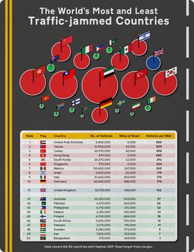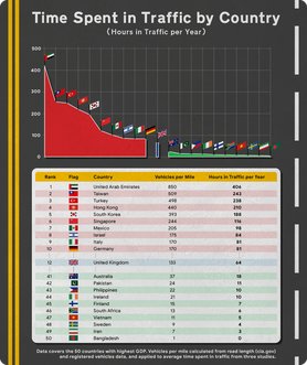 A számítások során figyelembe vették az országban regisztrált autók számát, a közutak hosszát, és hogy ne legyen félrevezető a tabella, csak a világ 50 legmagasabb GDP-jével rendelkező országot vizsgálták. A forgalomban töltött időhöz az ENSZ várható élettartamát, három másik tanulmány eredményeit és az országok jármű/mérföld adatait használták fel.