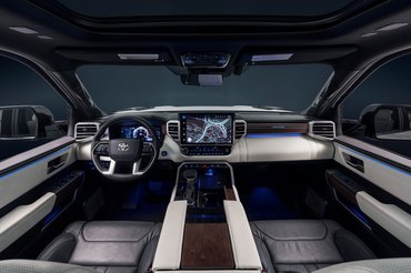 A telibe fényezett karosszéria, a krómszínű tükörházak, a szintén krómtól fénylő hatalmas hűtőmaszk, és a 22-es kerekekre szerelt alacsony profilú gumik alapján már messziről egyértelmű, hogy ez itt a Tundra széria csúcsmodellje, de igazán a belső tér árulkodik arról, hogy milyen közönségnek szánták a Capstone-t. A bőrkárpitok, a valódi fabetétek, a 12 hangszórós JBL hangrendszer, és a 12,3 hüvelykes érintőképernyőn kezelhető fedélzeti számítógép is azt sugallja, hogy itt nem nagyon spóroltak a tervezők.