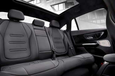 Megjelenésre egyébként nem különösebben sportosak az AMG EQE-k sem: az egyetlen feltűnő eltérés, hogy itt egy kicsivel nagyobb alsó légbeömlőket alkalmaztak. A hűtőrács helye viszont itt is teli műanyag, az egyetlen eltérés, hogy itt a rács-imitáció határozott, függőleges csíkokból áll. Spoiler alig került az autóra: jól látszik, hogy a tervezők nem akarták elrontani az autó légellenállását, még a látványosabb megjelenés kedvéért sem.