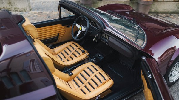 1973 májusában készült el ez a 246 GTS, mely egyike a nagyjából 50 darabnak, ami ezt a csodálatos Rosso Cordoba nevű bordó fényezést kapta. Az amerikai specifikációs autó belterét barna Connolly bőrrel kárpitozták, az ülések hurkáit Daytona stílusban varrták. Klímaberendezéssel és elektromos ablakemelőkkel szerelték, valamint 14 colos magnézium Campagnolo kerekeken vette át első tulajdonosa a kaliforniai Los Angelesben.