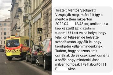 Megdöbbentő bejelentést kapott az Országos Mentőszolgálat a napokban: egy férfi azt nehezményezte, hogy a Bem rakparton szabálytalanul parkoltak betegellátás közben. Az OMSZ az üzenetet (amelynek a helyesírásán most inkább ne is botránkozzunk meg) és az arra adott választ is közzétette közösségi oldalán. A panaszt jegyző F. Ákos – akibe a jelek szerint igen kevés empátia és tolerancia szorult – úgy érezte, csak azért állt meg így a mentő, hogy mindenki jól lássa, milyen fontos munkát végeznek.
