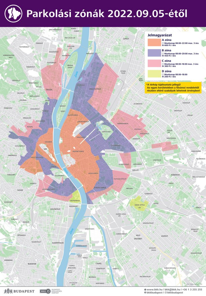 A-zóna: díj: 600 Ft, 8 órától 22 óráig, várakozási idő max. 3 óra