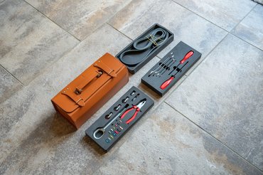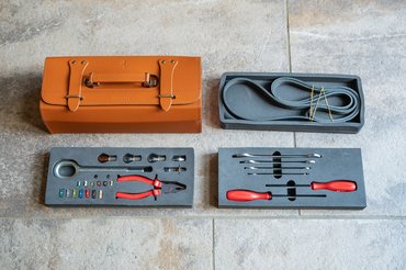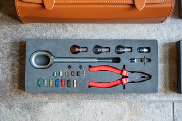 Egy ilyen autóba nem valami béna zsákba rakják a szerszámokat, ugyan már: könnyfakasztóan csodás, világosbarna bőrből készült táskában ücsörögnek a szerszámok. A táskán belül három, szivacsból készült tálca van, amikben pontosan kialakított helyeken vannak a tartozékok. Vannak biztosítékok, villáskulcsok, vonószem és még piros nyelű csavarhúzók is. Sőt, még egy ékszíj is a szett része, ha esetleg az eredeti elfáradna.