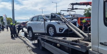 A Transit ellenben leesett a trélerről, oldalára borult, sofőrje pedig súlyos sérüléseket szenvedett. A Fordot csörlővel állították talpra, míg az összetört Suzukikat darus autómentővel emelték le a szállítóról a tűzoltók.