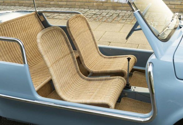 A kisautó színösszeállítása rendkívül stílusos, a világoskék fényezéshez nagyon jól illik a csíkos vászontető, a króm kiegészítők és a világos, rattan borítású ülések is.