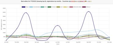 Tesla Model Y-ból szeptemberben közel 30 ezer került átadásra, októberben viszont már csak 2733 darab – ezzel az első helyről a top 50 alá csúszott a Tesla, elsősorban logisztikai okokból – a berlini gyár még nem tart ott, hogy kiszolgálja az európai igényeket, a kínai gyárból pedig csak tömbösítve, a negyedév elején érkeznek autók Európába, akkor viszont hatalmas dózisban.