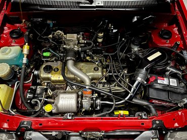 A piros RS Turbo nem felújított, hanem az eredeti állapotát őrizték meg ennyire hatékonyan. A felnik ugyan már nem az eredetiek, viszont valószínűleg bárki meg tud békélni ezekkel a korhű Enkei darabokkal is. A gyári Recaro sportülések is megvannak, sőt, a gyári matricák is jó állapotban maradtak meg. Nem nehéz rákívánni, az egyszer biztos.