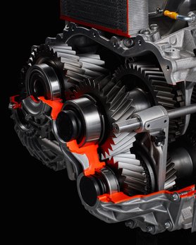 Az új váltó szintén teljesen saját fejlesztés. Nyolcsebességes, duplakuplungos, integrált elektromotorral a hátsó tengelyen. 560 mm hosszú, 750 mm széles és 580 mm magas. Emellett 193 kilót nyom a 110 kW-os és 150 Nm nyomatékú motorral együtt.