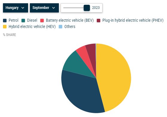 Ezen belül 22,2 százalékkal több (4199) villanyautót, 19,3 százalékkal több (4261) plug-in hibridet, 6,7 százalékkal több (33 302) hibridet, 14,2 százalékkal kevesebb (30 675) benzinest és 8,9 százalékkal kevesebb (10 108) dízelt helyeztek forgalomba az idei év szeptemberéig.