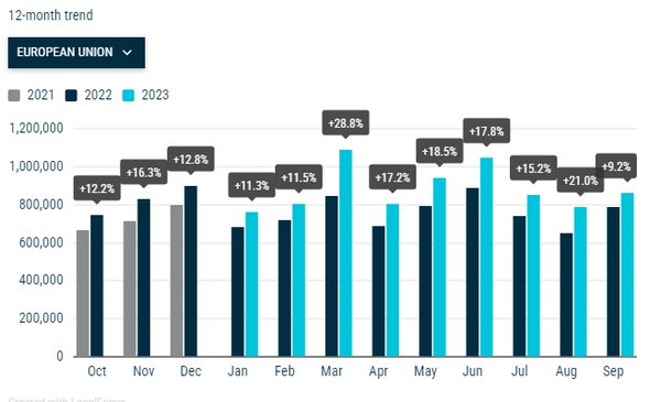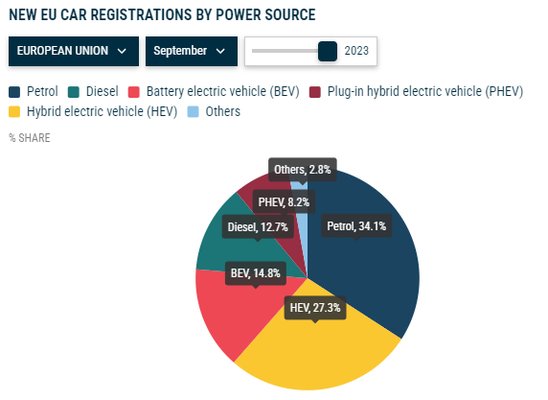 Szeptemberben villanyautókból 127 149-et helyeztek forgalomba, 14,3 százalékkal többet a tavaly szeptemberinél, ezzel a piaci részarányuk 14,8 százalék. A forgalomba helyezett hibrid autók száma 30,5 százalékkal, 235 348-ra bővült éves összevetésben, a piaci részarányuk 27,3 százalék volt. A plug-in hibrid autók eladása pedig 0,4 százalékkal, 70 578-ra nőtt, piaci részesedésük 8,2 százalék volt.