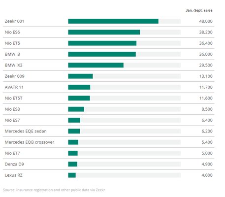 A Mercedes viszont a legfontosabb piacon, Kínban is kissé küszködik, csak ott másként. A márka egyik modellje sem jutott be a tíz legkelendőbb prémium villanyautó kategóriájába - ellenben a BMW-vel. Január és szeptember között a Mercedes 6200 darab EQE-t tudott eladni, amivel a lista 11. helyére kerültek. A BMW két modellje is benne van a top10-ben, az i3 36400 darabbal és az iX3 36 ezerrel. A lista tetején a Zeekr 001-et találjuk 48 ezer eladott darabbal.