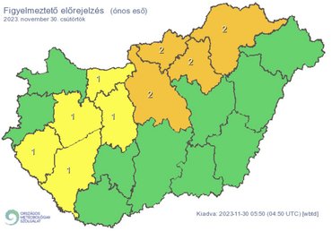 Nem sokkal reggel 7 óra után a figyelmeztető előrejelzés szerint Pest, Nógrád, Heves és Borsod-Abaúj-Zemplén vármegyében lehet tartós - többórás - ónos esőre számítani. Az ország több részében "gyenge" - 0,1 milliméternél kevesebb - ónos eső várható, emellett havazásra és esőre is fel kell készülni. Az OMSZ tájékoztatója szerint a várható csapadékfajták területi kiterjedése és mennyisége is nehezen előrejelezhető! Időjárási helyzet függvényében lehet, hogy az ónos esőre piros riasztást adnak ki a nap folyamán! Ha így lesz, akkor újabb riasztás ad majd ki az OMSZ. Reggel egyébként zöld, citromsárga és narancssárga riasztások voltak érvényben a különböző vármegyékben.