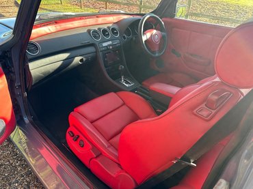 Beltere vörös bőrborítást kapott a jó VW konszernes fekete műanyagelemekkel. Az ülések fűthetőek, elektromosan állíthatóak, klíma van és érintőskijelzős infotainment is - viszont az egésznek a ékköve mégis a tekerős ablakemelő. Érdekes konfiguráció, na.