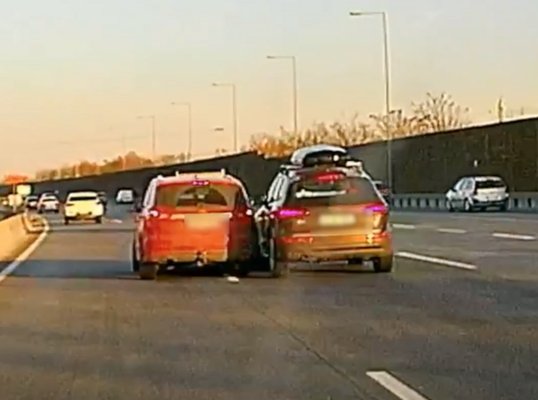 Most az M0-s autóúton gondolta úgy két okos pilóta, hogy az a legjobb megoldás a forgalmas autóúton, ha helyben megmérik, hogy kinek mekkora. Az S-Max semmiképp nem akarta beengedni maga elé az Audit, aminek a sofőrje természetesen azért is bepasszírozta a Ford elé a Q5-öt, hiszen a német prémiumnak ott a helye a belsőben.