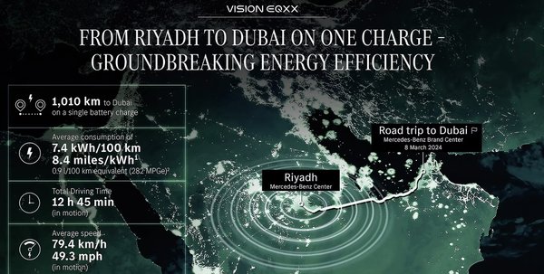 Mivel a teszt valós körülmények közt, a Rijád és Dubai közti forgalmas úton zajlott, így a közel 15 órán át (14:42) tartó útből 12 óra és 45 perc volt a haladással töltött, az autó mozgásban mért átlagsebessége pedig 80 km/h körül alakult, szóval cammogásról nem beszélhetünk, a maximális elért sebesség is 140 km/h volt.