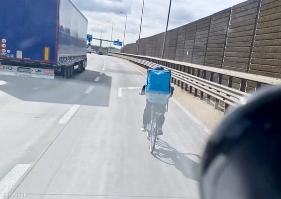 Vannak olyan közlekedők, aki igen lazán kezelik a szabályokat: itt van például ez a kerékpáros ételfutár, aki úgy gondolta, hogy remek ötlet felhajtani az M0-s autóútra a kamionok és a 110-zel haladó autók közé.