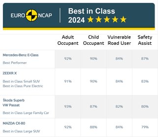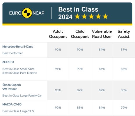A legbiztonságosabb elektromos és kicsi SUV címét a kínai Zeekr X nyerte el (44 tesztelt modellből 20 ebbe a kategóriába volt sorolva), a legbiztonságosabb nagy családi autó címet a Skoda Superb és Volkswagen Passat, míg a Mazda CX-80 a nagy SUV kategóriában győzedelmeskedett.