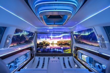 Rengeteg a látványos, fényes, csillogó üvegfelület van az autóban, ami mögött különböző funkcionális- vagy dísztárgyakat – jellemzően hangszórókat – helyeztek el. A műszerfal egy nagy táblából áll, amit három kisebb, érintőkijelzős szekcióra osztottak szét, mégsem ez a legnagyobb megjelenítő felület az autóban. A hátsó utasok beszállása után kiemelkedik az első ülések mögül egy 65 colos (165,1 cm) képátlójú, 4K képfelbontású kijelző, illetve hét különálló projektorral a beltér további felületeire is képesek vetíteni, ezzel fokozva a hangulatot. Hogy teljes legyen a moziélmény, a Vison V-ben egyszerre 42 hangszóró szórakoztatja a hátsó utasokat.
