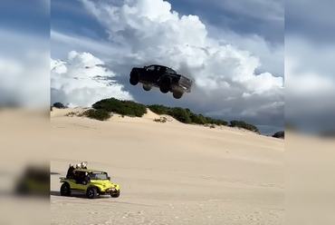Hatalmas tempóval nekifutnak egy homokdűnének, ami úgy elhajítja a nehéz Raptort, mintha súlytalan lenne. A Ford olyan magasra emelkedik, hogy az valószínűleg nem hivatalos világrekord. A repülési magasság saccra van vagy 15 méter, a leírások szerint az ugratás hossza nagyjából 85 méter.