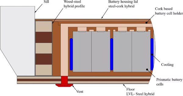 Az akkumulátorburkolat alapját képző nyír-, nyár- és császárfa elemeket vékony acélréteg borítja. A szerkezet előnye, hogy a gyártásának energiaigénye sokkal alacsonyabb, mint az alumínumé, ráadásul a fa sejtszerkezete energiaelnyelési szempontból is jobbnak bizonyult. A fa-acél kompozit házak az eddigi tesztek alapján 98%-kal több energiát képesek elnyelni, mint a képlékeny- és 76%-kal többet, mint a nagy szilárdságú alumínium.