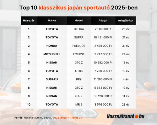 Felmérést készített a Használtautó.hu azzal kapcsolatban, hogy milyen érdeklődést mutatnak a hazai vásárlók a japán sportautók iránt. Ezekre a modellekre komoly figyelem fordul nemcsak a gyűjtők vagy a klasszikusra vágyók, hanem a tuningműhelyek és építők körében is. A listát az érdeklődők számát tekintve és eladásokban is vezeti a Toyota, de szorosan mögötte van a Honda, a Nissan, a Subaru és egy modellel még a Mitsubishi is.