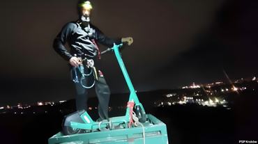 A lengyel hatóságok is találgatnak azzal kapcsolatban, hogy került fel ez a körülbelül 20 kilós bérroller egy 41 méter magas hídpillér tetejére. Krakkó külvárosában, a Visztula folyó egyik hídjánál járunk, ahol hivatalosan gyalogos és kerékpáros forgalom sincs, valahogy azonban mégis felkerült a pillér tetejére ez a csodaszép zöld bérroller.