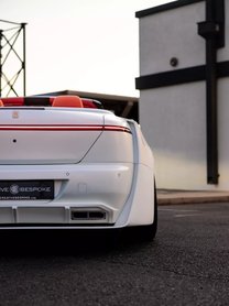Sőt, nem is kicsit. Kezdetnek a legendás, álló bordákkal ellátott Rolls-Royce maszkot kicserélték egy olyanra, amiben kisebb-nagyobb háromszögek váltakoznak. Ugyanez a motívum jelenik meg a kisebb szellőzőkön is. Az idomok aránytalanul bumfordik lettek, az eredeti fényszórók alsó felét részben ki is takarják, a hatalmas Creative Bespoke felnik felett pedig durván kiszélesített sárvédőidomok vannak. Ezeknek megfelelően kitolták a küszöböt, a hátsó sárvédőket és aránytalanra rajzolták az autó farát is.