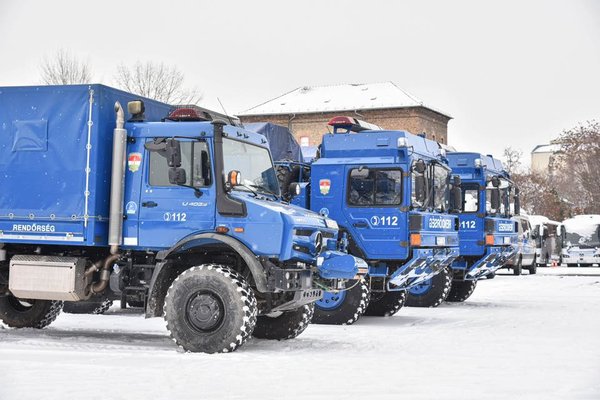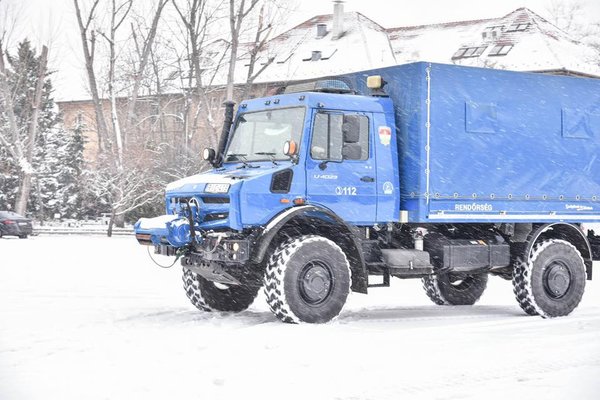 A hatalmas gumikat hordó, magas, összkerékhajtású Merci Unimogokkal és Rábákkal olyan helyekre is eljuthatnak a rendőrök, ahova normál autóval lehetetlen lenne. Erre most tényleg szükség is van: az országban vannak olyan területek, amiket nehezebben érintett a havazás, mint a nagyobb városokat.