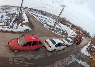 A vontató egy vontatásra tökéletesen alkalmas eszköz, egy Belarusz traktor volt. Mögötte szépen libasorban érkeztek a látványosan rossz állapotú autók, vagyis ami megmaradt belőlük. Elöl egy fonnyadt Volkswagen Bora, mögötte egy kornyadt Seat Cordoba, végül pedig egy ványadt Suzuki Swift.