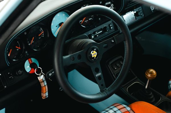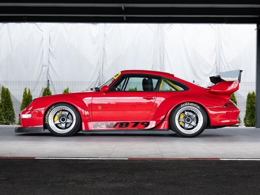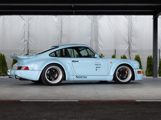 Az RWB nem szimpla tuning, hanem inkább művészet: itt minden vágás és szegecs a mester, Akira Nakai saját kezének nyomát viseli, így nincs két egyforma darab, csak egyszeri és megismételhetetlen karakterek. Talán egyetlen más műhely sem nyúl olyan bátran, de közben jó stílusérzékkel a klasszikus Porschékhoz, mint az RWB: a duó egyik tagja a Nintai (japánul kitartás), egy 964-es alapokra épített, Super Wide szettes fenevad. 1940 mm-ével húsz centivel szélesebb a gyári modellhez képest, de ha ez nem lenne elég, ott a Miami Blue fényezés, illetve a Momo kormány és a fa váltogómb.