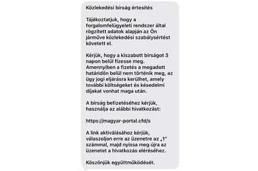 “Tájékoztatjuk, hogy a forgalomfelügyeleti rendszer által rögzített adatok alapján az Ön járműve közlekedési szabálysértést követett el. Kérjük, hogy a kiszabott bírságot 3 napon belül fizesse meg. Amennyiben a fizetés a megadott határidőn belül nem történik meg, az ügy jogi eljárásra kerülhet, amely további költségeket és késedelmi díjakat vonhat maga után” – olvasható a gyanús üzenetek egyikében.