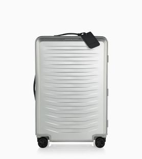 Maga a bőrönd továbbra is ugyanaz a Roadster Aluminium gurulós modell, amelyet a Porsche tavaly mutatott be. A héjszerkezet préselt alumíniumpanelekből áll, amelyeket egy merev vázra rögzítettek, látható szegecsek vagy vaskos sarokelemek nélkül. A Porsche szerint a formát az eredeti 911 Targa alumínium bukókerete ihlette – amely pontosan az a mondat, ami egy Porsche-sajtóanyagban nagyon jól hangzik.