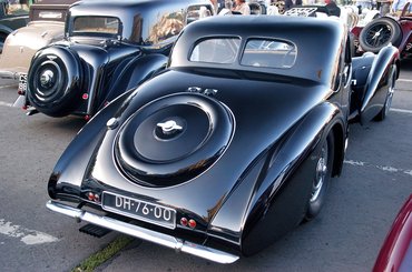 Vagy a középen lapuló, Gangloff-karosszériás Bugatti Type 57 SC. Az egyenes vonalnak és a derékszögnek mutatott reneszánsz fricska, a hat darab, egymás mellé kihúzott kipufogóvég.