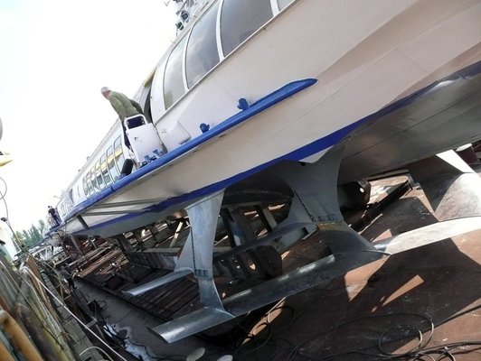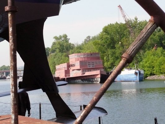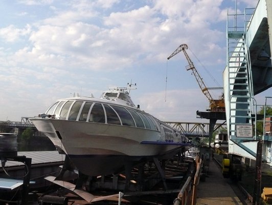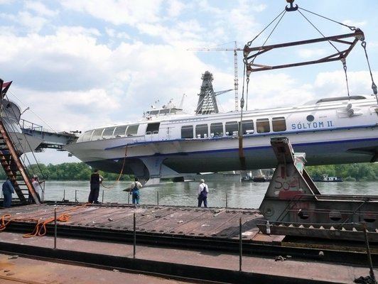 Aztán látunk egy pokoli építményt, ami akkor is inkább illene valami szürreális Tarkovszkij-látomásba, semmint a Dunára, ha átkennék rajta a mínium alapozót. Pedig ezt étteremhajónak szánják, csak ez is kicsit lassan készül, jelen stádiumában olyan ocsmány, hogy nélküle összehasonlíthatatlanul szebb volna a kilátás. Közben egy pontonon hozzák utánunk a keretet, amivel majd a Sólymokat emelgetik, én viszont megnézem a Sólyom III. jobb mellső uszonyát, ami kicsit hullámos. Bizony, ezzel a hajóval zúztak le a hollandok 2002-ben egy hídpillért, amikor még holland zászló alatt, Willem Alexander koronaherceg nevén futott ez a meteor. Úgy látszik, nem csak autókat hozunk törötten Hollandiából.