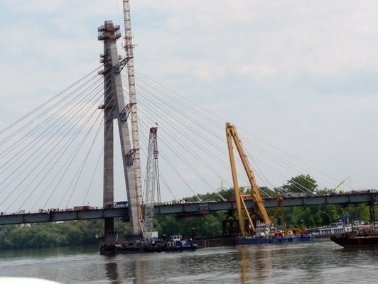 Kint a nagy Dunán Samu hetykén kikanyarodik előlünk, vissza a kikötőbe, miután ledobtuk a vontatókötelet. A Sződliget is átad minket a Hunyadinak, ami egész jó tempóban visz észak felé. Klasszikus dunai hajóslátvány, egy uszályszimulátor nem is nagyon zabálná a memóriát és követelné a legújabb videokártyát: jobbról-balról erdő, középen víz. Erdő, erdő, víz, víz, nyaralók, fák, nyaralók, víz, szennyvíztisztító telep, ártéri erdők, víz, aztán a fakoronák felett homályosan, de feltűnik a Chuck Norris híd két pilonja, meg a hozzájuk rögzített, még náluk is magasabb toronydaruk.