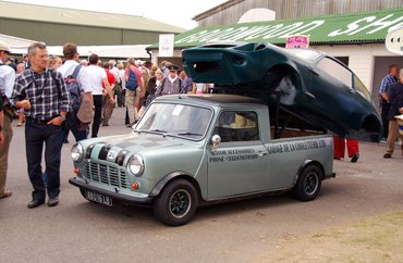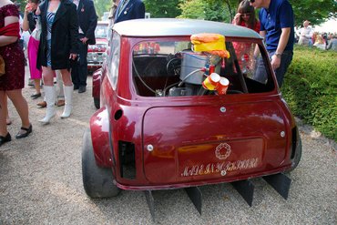 Az első, ami feltűnt, egy MG-féle Mini volt. Vagy hat méter hosszan terült el a tájban, kék vinyl-teteje egy Kusturica-film menyegzőjén szerepelhetett volna ünnepi asztalként. Na ja, Miniből nem nehéz limót készíteni, hiszen a mechanika eleje és a hátulja külön segédkereten van, közte csak némi pléhlemezt kell betoldani. Meg adni neki némi erősítést. De azért látni egy ilyet, meg gondolatban elkészíteni egész más.