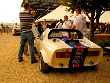 Aztán ott volt az 1963-as Cox. Fogtak egy Mini első és hátsó segédvázat, benne a komplett mechanikával, tuningoltak rajta kicsit, majd egy saját gyártású acélvázba beépítették. A karosszéria persze műanyag – ha innen nézzük, kicsit Corvette, ha onnan, akár Trabant is lehetne, persze csak az anyag miatt, mert különben zsír.