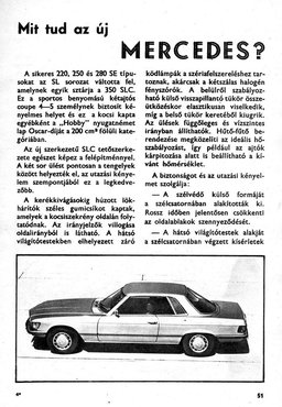 Eszembe jutott, hogy vannak nekem a padláson régi műszaki magazinjaim, gyerekkoromból. „Technikai érdekességek a világ minden tájáról”, ez volt a sorozat címe, negyedévente jelent meg egy újabb szám, könyv formátumban, több mint 200 oldalon, építészettel, lakáskultúrával, elektronikával, híradástechnikával, modellezéssel és persze motorokkal és autókkal. Kisebb hírek forró nyomain haladva az 1972/2. számban (ára: 10 Ft, de én 6-ért vettem antikváriumban) rátaláltam a lényegre, egy háromoldalas cikkre: „Mit tud az új Mercedes?”. Mi, a Zsigulik és Trabantok világában élő, a puha diktatúra bársonyos igája alatt senyvedő olvasók megtudhattuk, hogy az SLC formáját szélcsatornában kísérletezték ki, hogy még az ajtók belseje is fűtött, ja és hűtött is, merthogy az autó légkondival is rendelhető. Meg hogy a tengelyekre eső súlyelosztás 50-50 százalék, a kétkörös fékberendezés blokkolásgátlóval szerelt. Legfőképpen pedig, hogy az új kupé a nagyteljesítményű sportkocsinak és a kényelmes limuzinnak szerencsés kereszteződése. Nyilván keresztezést akart írni a szerző, ez tehát az autós újságíró klasszikus freudi elszólása volt. A mellékelt gyári fotókról az is kiderült, hogy „álló helyzetben is rohanni látszik ez a Mercedes coupe”.