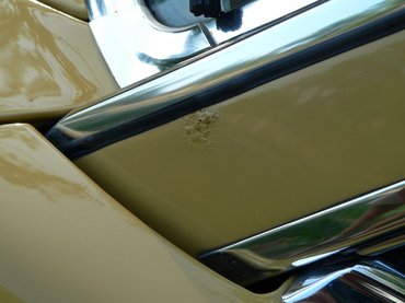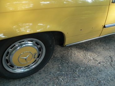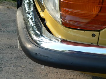 A templomnál félreálltunk, akkor kellett volna következnie a szigorú szemrevételezésnek, ami jó, ha felében-harmadában sikerült. Láttam, hogy vannak kisebb sérülések a lökhárítók gumibetétjein – de ez várható volt. Láttam, hogy az első ütköző kicsit csálén áll, de gondoltam, hogy biztosan nem nehéz beállítani. Így az ütközőkön nem ütköztem meg egyáltalán, főleg, hogy a krómozásuk még elég tisztességesen festett. A beltér már útközben elvarázsolt, alig láttam kopásnyomot, a kellemes bézs miliőben otthonosan éreztem magamat, jólesően elnyújtózva a szövet-műbőr kombinációval kárpitozott üléseken. Csiki listájáról annyi rémlett, hogy a karosszériát laposan át kell nézni, találtam is egy csúnya pörsenést a baloldali A oszlopon, egy diszkrétebbet a hátsó ablak aljánál, meg féltenyérnyi kopást az egyik dísztárcsán, de azt például már csak később, itthon vettem észre, hogy a bal első sárvédőn hólyagosodik felfelé a festék. Az is kiderült, hogy a kerékíveket, a küszöböket már javították, és körbe is festették az autót, de 35 évesen előfordul az ilyesmi, ha az észak-német telet nem a garázsban, hanem az utakon tölti az autó.