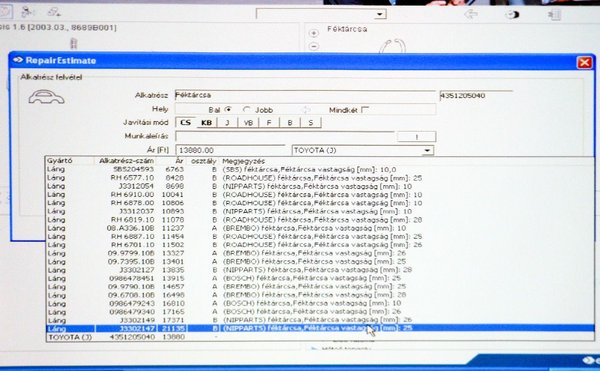 Az Eurotax Repair Estimation nevű szoftvere ugyanezt már alapból tudja: egy adott alkatrészre rábökve több cikkszámot dob fel – nem csak a gyáriakat, hanem az utángyártottakat is. Bár, Borbély Gergely, az Eurotax termékfelelőse pont egy olyan példát mutatott a programjukban, amely azt igazolta, hogy a gyári alkatrésznél létezik lényegesen drágább utángyártott. Egy típus első féktárcsája gyáriként 13 880 forintba került – a helyettesítő terméket 6700-tól 21 135 forintig lehetett megkapni. Vagyis, nem árt odafigyelni.