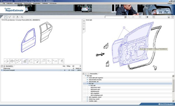 Az előbbi cég AudaPad nevű programjának használatával a DEKRA-Expert Kft.-nél ismerkedtem. Az adatbázis mérete döbbenetes lehet, sok típusnál alvázszám alapján kiköpi az autó specifikációját. A szükséges javításokat robbantott ábrákon lehet egyszerűen kijelölni, és a program van annyira okos, hogy ha két alkatrész cseréjéhez el kell végezni ugyanazt a munkafázist, akkor csak egyszer veszi figyelembe. A rezsióradíj, a fényezési eljárás és még néhány paraméter megadása után pedig a képernyő alján megjelenik egy szám, hogy mennyi lesz az alkatrészköltség, mellette pedig a komplett javítás díja. Az Audatex az utángyártott alkatrészek cikkszámait tartalmazó modult egy fizetős kiegészítő modulként kínálja.