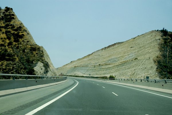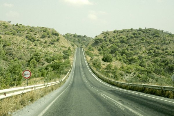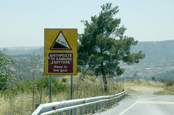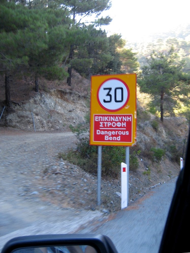 Az útjelző táblák a hegyekben is megkavartak néha minket, mert nem ritka, hogy egy elágazásnál ugyanaz a falu két vagy három irányba is ki van táblázva. Pedoullas balra 15 km jobbra 9. Ez nagyobb csomópontoknál előfordul, az viszont sehol sincs kiírva hogy melyik a felsőbb rendű út, vagy részletezve, pl. mint nálunk, hogy Székesfehérvár-dél. Sok helyen hiányoznak az előjelzők, ez pl. már országúti sebességnél is kényelmetlen, pláne, hogy a hegyekben esetenként 10-20 km-t is kell autózni, amíg lesz egy megfordulásra alkalmas hely. Egyébként is kisebbek a tábláik, mint a mieink, sokkal közelebb kell menni hozzájuk, mire kiderül, hogy mi van rájuk írva. És ugyan általában véve a szigeten kevés a növény, azért az utópályákon a táblák elé rendre odanövesztenek egy fát vagy bokrot, és még a legbonyolultabb helyeken sincsenek az út fölé elhelyezett, besorolást vagy útirányt jelző táblák. Nagyon sok a körforgalom, van hagyományos, többsávos és spirális is, amibe irányonként akár három sáv is bemehet.