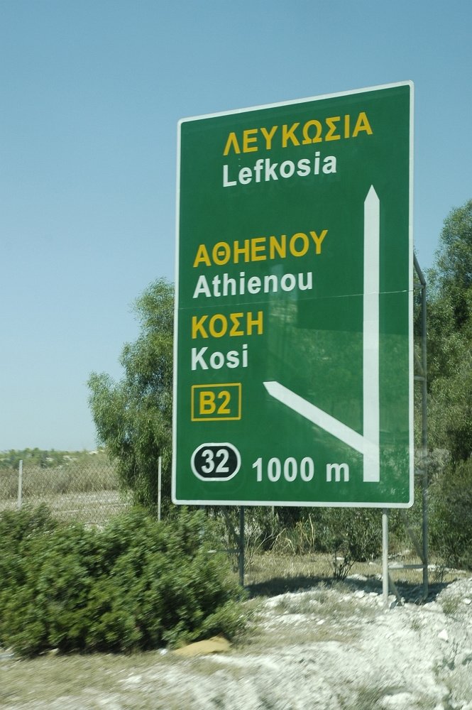 És akkor még nem beszéltünk azokról a városokról, amelyeknek török neve is van, mondjuk az is kettő. (Pl. egyszerű eset a Λεμεσός=Lemessos=Limasol, érdekesebb a Λευκωσία=Lefkosia=Lefkoşa=Nicosia, kifejezetten érdekes viszont a Αμμόχωστος= Ammóchōstos= Famagusta =Gazimağusa=Mağusa) Azért a legtöbbször el lehet találni a megoldást, de a török oldalon sok városnév kiírása nem is hasonlított az egyébként minden más szempontból igen jónak bizonyuló olasz kiadású autóstérképünkön szereplő városnevekhez.