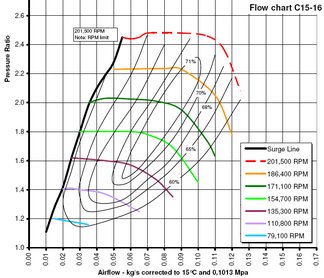 Nézzük a további alternatívákat az Almera feltöltésére. Műszakilag a legegyszerűbb megoldás a Rotrex cég által gyártott feltöltő, amely nem más, mint egy centrifugálkompresszor, mechanikus hajtással. Vagyis a kompresszor ugyanolyan, mint a klasszikus turbóban, viszont nem kipufogógáz-turbina pörgeti, hanem ékszíj hajtja. Persze ahhoz, hogy érdemben levegőt szállítson, ahhoz egy gyorsító áttételre is szükség van, erre egy bolygóművet építettek be a hengeres házba, amely nagyjából 12-szeres áttételt hoz létre. Persze, lehet játszani még lehet az ékszíjtárcsával, hisz a legkisebb modell névleges fordulatszáma 200 000/perc, és ezzel az áttétellel te valahol 70 000 táján jársz maximum. A motor illesztési görbéjét akarnád megszerkeszteni, íme a szállítási jellegmező.